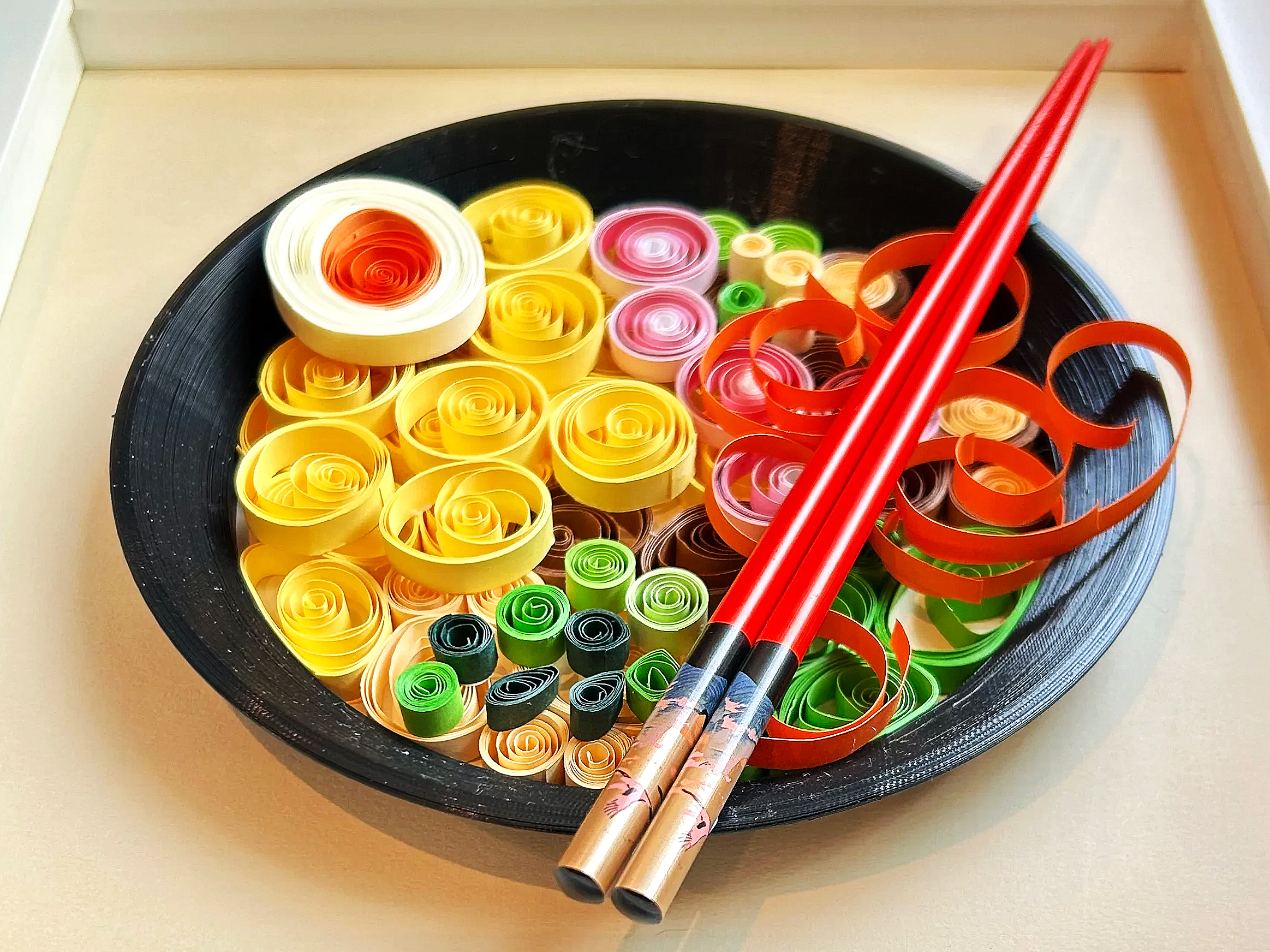 A dark bowl gathers tightly wound coils shaped by hand, arranged like noodles held in broth. Each form is rolled and placed deliberately. Red chopsticks rest across the surface, suggesting use rather than display.