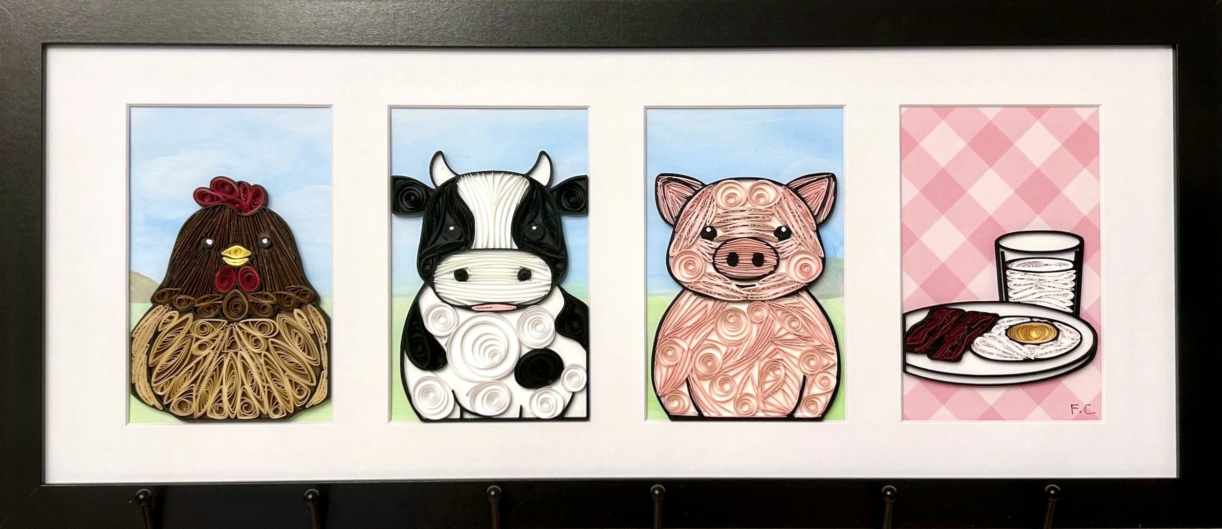 The Breakfast Club places three farm animals alongside a familiar breakfast, holding both states within the same frame.